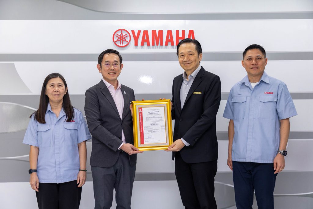 นายพงศธร เอื้อมงคลชัย ประธานกรรมการบริหาร นางสาวบัวทิพย์ จันทร์ดำรงกุล ผู้จัดการใหญ่ด้านการเงิน วางแผน พร้อมด้วยคณะผู้บริหาร บริษัท ไทยยามาฮ่ามอเตอร์ จำกัด ถ่ายภาพร่วมกับ นายศราวุธ ศุภรัตนชาติพันธ์ ผู้จัดการฝ่ายการให้การรับรอง บริษัท บูโร เวอริทัส ประเทศไทย จำกัด ในการรับมอบประกาศนียบัตรรับรองระบบมาตรฐาน ISO 14064-1 : 2018 Greenhouse Gases การันตี ไทยยามาฮ่ามอเตอร์ ว่าเป็นองค์กรที่มีการจัดการ การปล่อยก๊าซเรือนกระจกอย่างเป็นระบบ และมีประสิทธิภาพเป็นไปตามหลักมาตรฐานสากล ตอกย้ำการดำเนินธุรกิจอย่างยั่งยืน มุ่งสู่เป้าหมายความเป็นกลางทางคาร์บอนใน Scope 1 – 2 ในปี พ.ศ. 2578 และ Scope 3 ในปี พ.ศ. 2593 ถือเป็นบริษัทเบิกร่องเจ้าแรกของอุตสาหกรรมยานยนต์สองล้อในประเทศไทยที่ได้รับการรับรองมาตรฐานนี้
