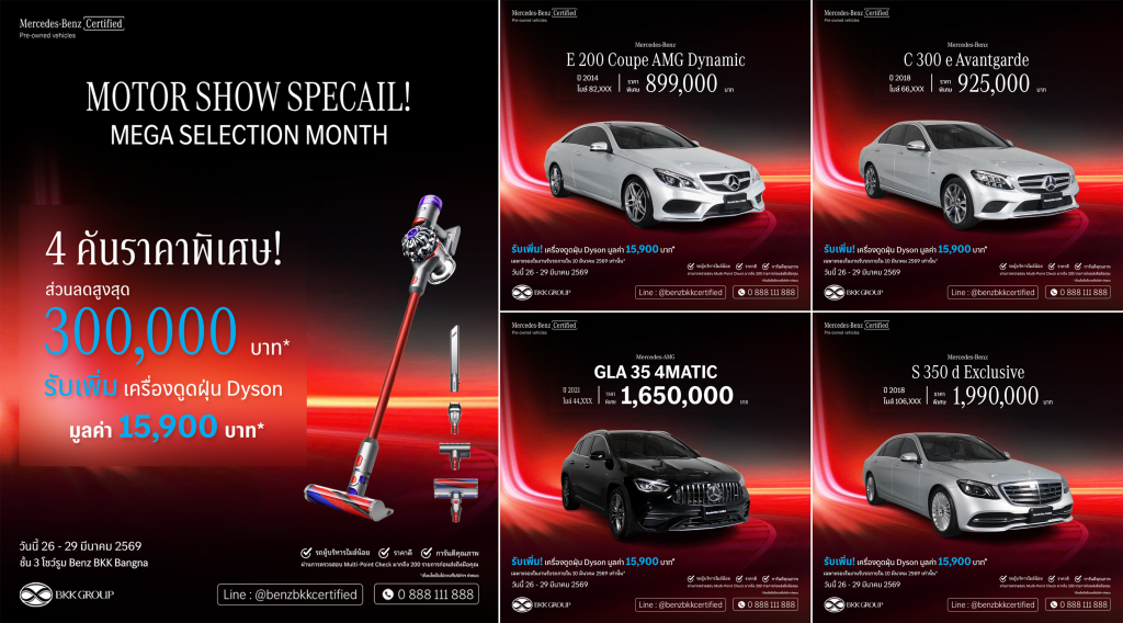 กรุงเทพฯ – Benz BKK Group-Bangna ผู้แทนจำหน่ายและศูนย์บริการรถยนต์ Mercedes-Benz อย่างเป็นทางการ เปิดตัวแคมเปญ “MOTOR SHOW SPECIAL!” ภายใต้ไลน์ Mercedes-Benz Certified by Benz BKK Bangna เพื่อตอบรับช่วงเวลาสำคัญของอุตสาหกรรมยานยนต์อย่าง Motor Show ซึ่งเป็นช่วงที่ผู้บริโภคมีความต้องการและความพร้อมในการตัดสินใจสูง โดยนำเสนอข้อเสนอพิเศษสำหรับลูกค้าที่ต้องการเป็นเจ้าของรถยนต์เมอร์เซเดส-เบนซ์คุณภาพระดับพรีเมียม ในราคาที่เข้าถึงได้ พร้อมมาตรฐานการรับรองจากเมอร์เซเดส-เบนซ์ โดยงานจะจัดขึ้นระหว่างวันที่ 26 – 29 มีนาคม 2569 ณ ชั้น 3 โชว์รูม Benz BKK Bangna